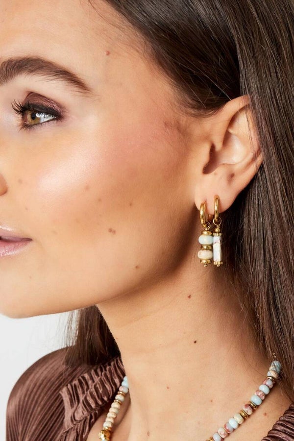 Hoe leuk zijn deze oorbellen met blauwe hematiet steentjes en gouden bolletjes. Oorbellen met stenen bolletjes zijn perfect voor elke gelegenheid! De oorbellen zijn uitstekend casual te dragen maar kunnen ook zeker geschikt zijn voor een feestje. De oorbellen zijn gemaakt van Stainless Steel en hematiet in combinatie met steen en hebben een afmeting van 3,8 cm. Verkrijgbaar in de kleuren lichtblauw en cognac.