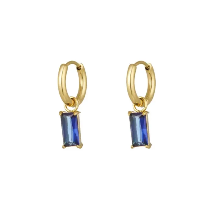Musthave alert! Hoe leuk zijn deze gouden oorbellen met langwerpig blauw steentje! Mega trendy en daarnaast perfect te stylen met meerdere oorbellen; zo kun jij jouw ideale ear party creëren. Daarnaast kun je deze oorbellen ook leuk dragen in combinatie met meerdere sieraden met leuke steentjes. De oorbellen zijn gemaakt van stainless steel en zirkoon en hebben een afmeting van 2 cm.